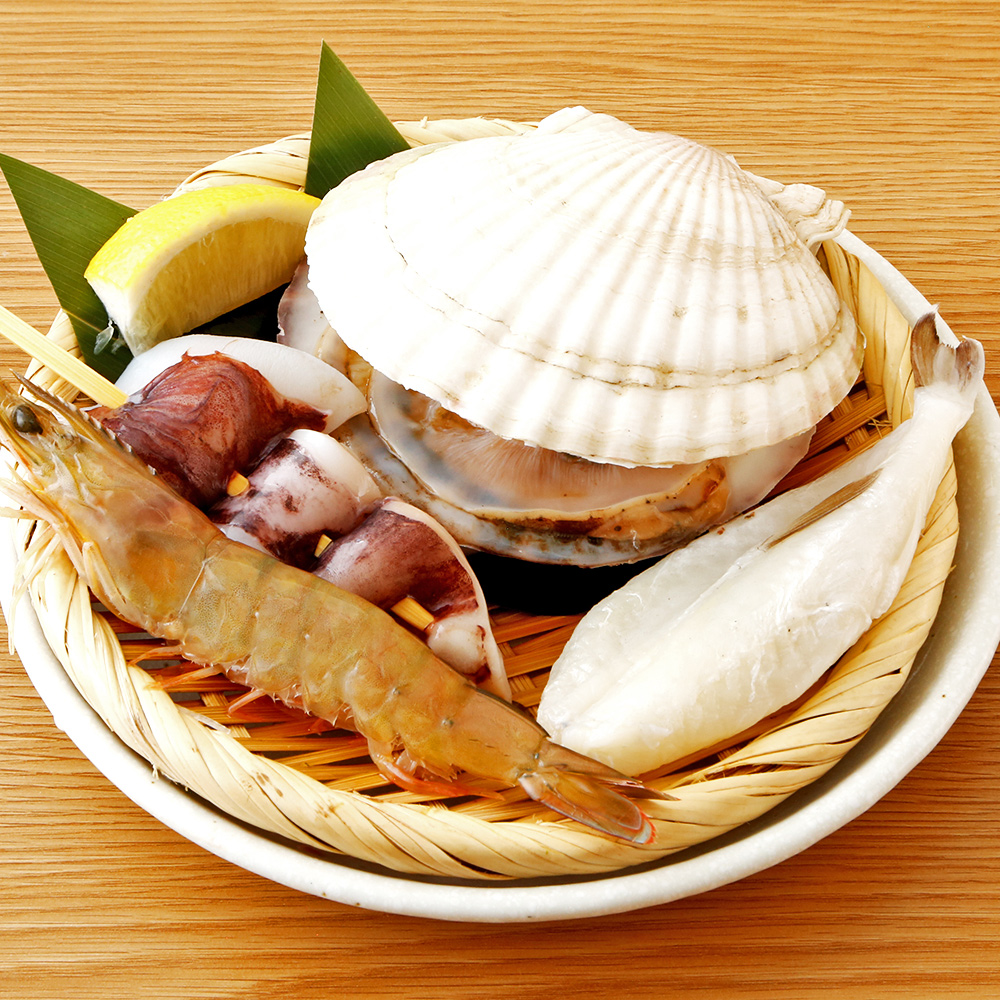 イカ串・天然有頭海老・帆立・ふぐの一夜干しの盛合せの人気メニューをセットに!焼きあがる海鮮の香りを感じられる、浜焼きの魅力が詰まったセットです♪